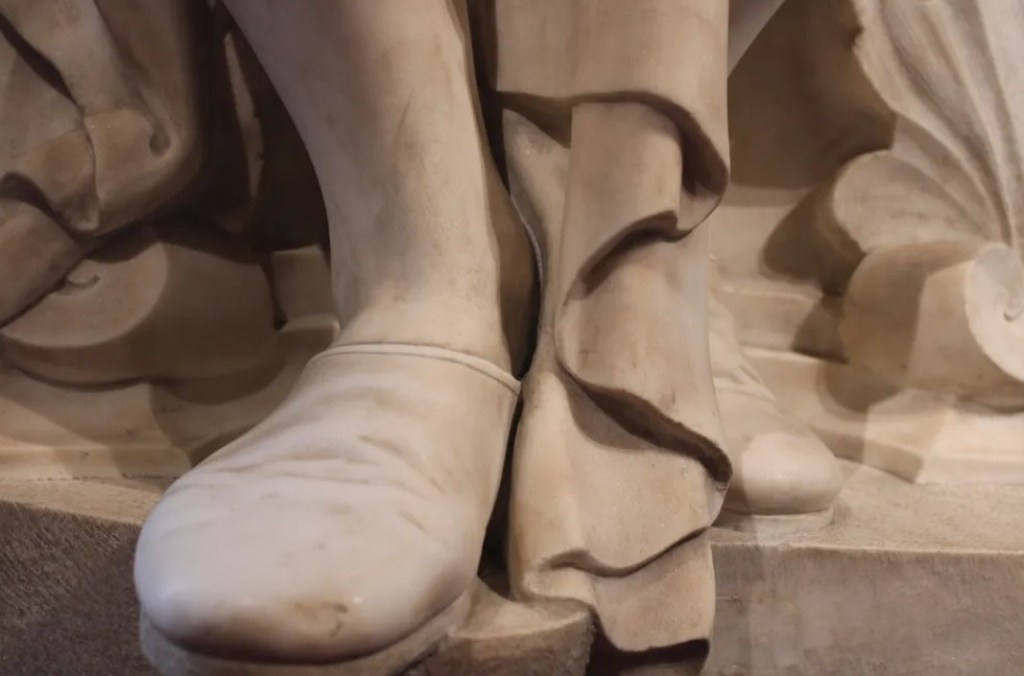 Visto così sembro quasi un filosofo con quella toga lunga decorata con un colletto stretto al collo grazie a due bottoni ed è proprio quella l’impressione che volle dare l’artista all’opera.