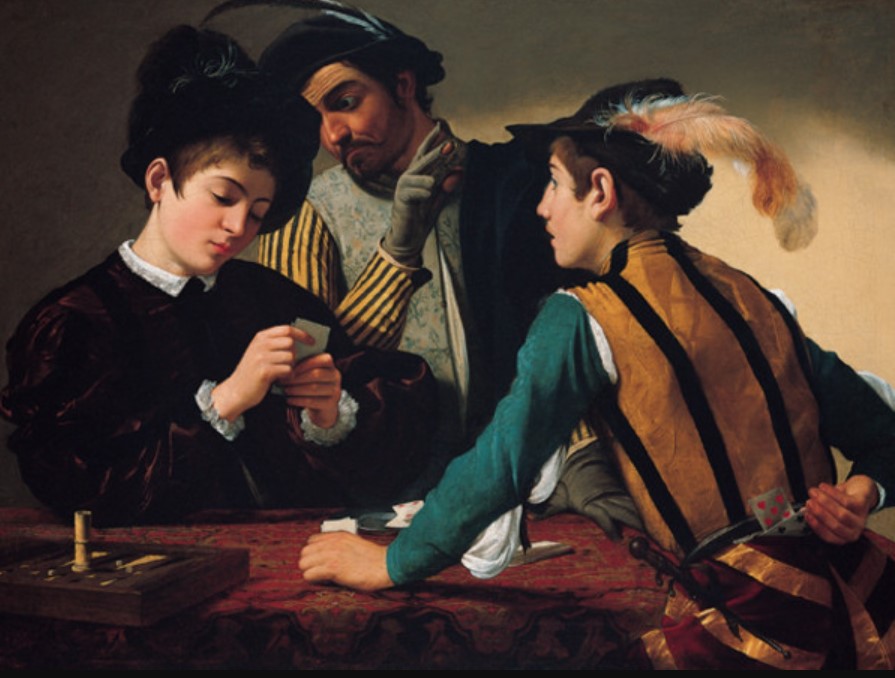 The painting of the cheaters features two boys playing cards and a slightly older cheater who helps the cheating player. The light coming from the left illuminates the players creating a bright atmosphere.