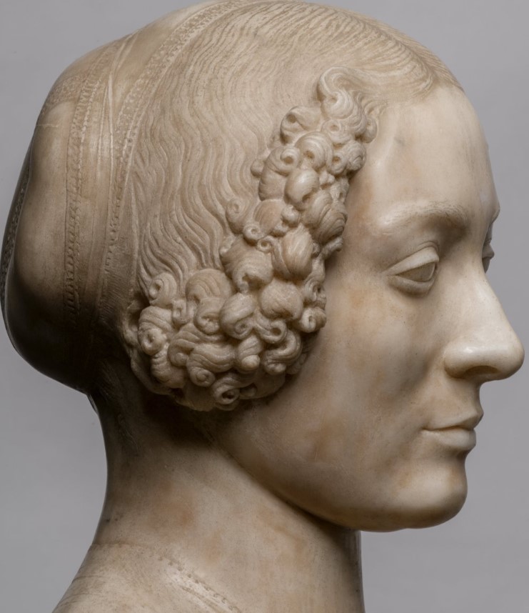 Il Verrocchio, per evitare di scolpire un busto austero e troppo rigido, scelse con attenzione di non usare una visione frontale ma preferì girare percettibilmente il volto della dama rispetto all’asse centrale.
