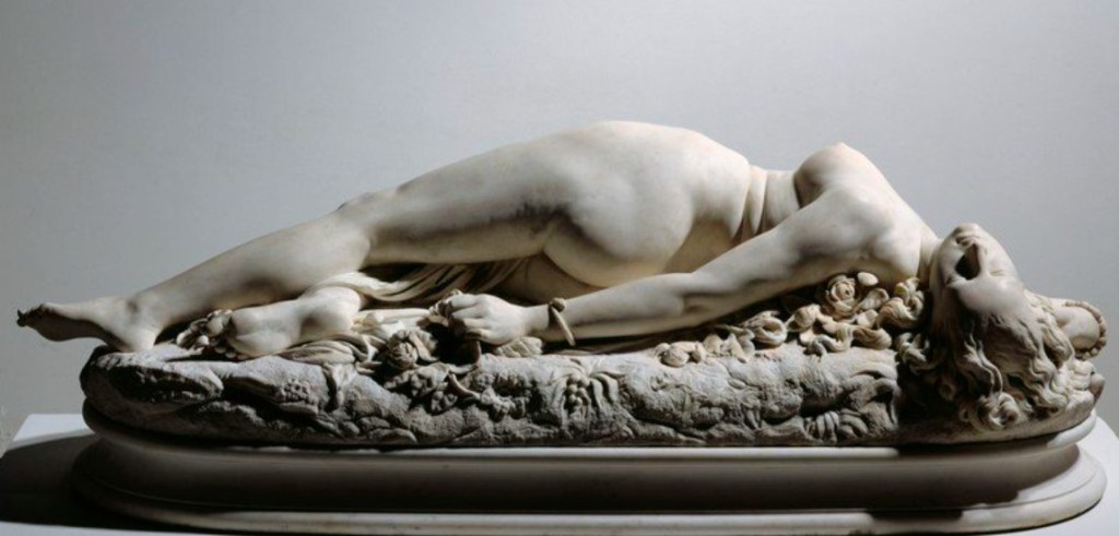 Auguste Clésinger aveva scolpito una donna completamente nuda con un drappo utile a coprirle solo una coscia. Il serpente avvolto al polso alla stregua di un bracciale l’ha appena morsa e lei si contorce dal dolore.