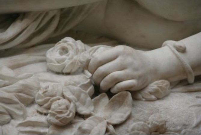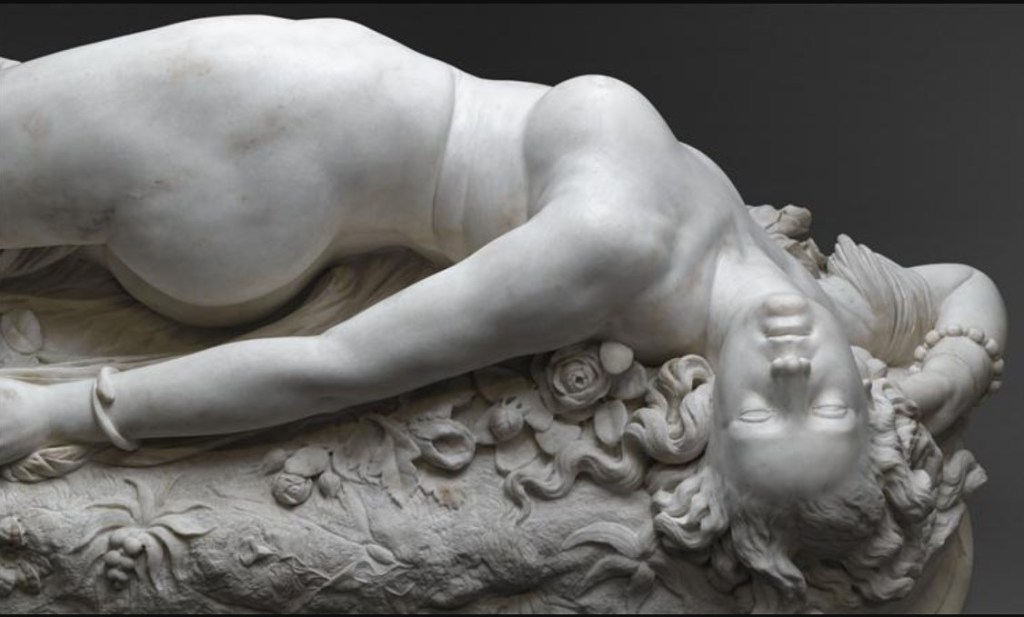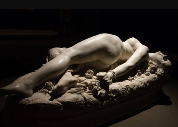 Auguste Clésinger had sculpted a completely naked woman with a drape covering only one thigh. The snake wrapped around her wrist like her bracelet has just bitten her and she writhes in her pain. The body of the young woman on the rock is surrounded by flowers and petals and, if you look closely at her face, you will realize that it is far from idealized: it is the portrait of a real face.