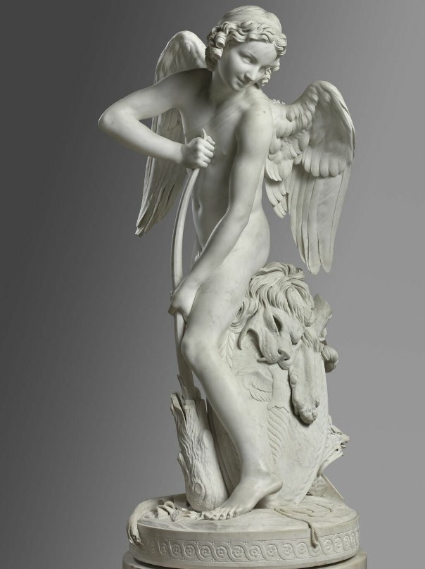 The sculpture of the day that I want to tell you about today has as its subject Cupid who draws his bow from the club of Hercules using the weapons of Mars. The work was sculpted by Edmé Bouchardon in 1750 and is now exhibited in the sculpture department of the Louvre.