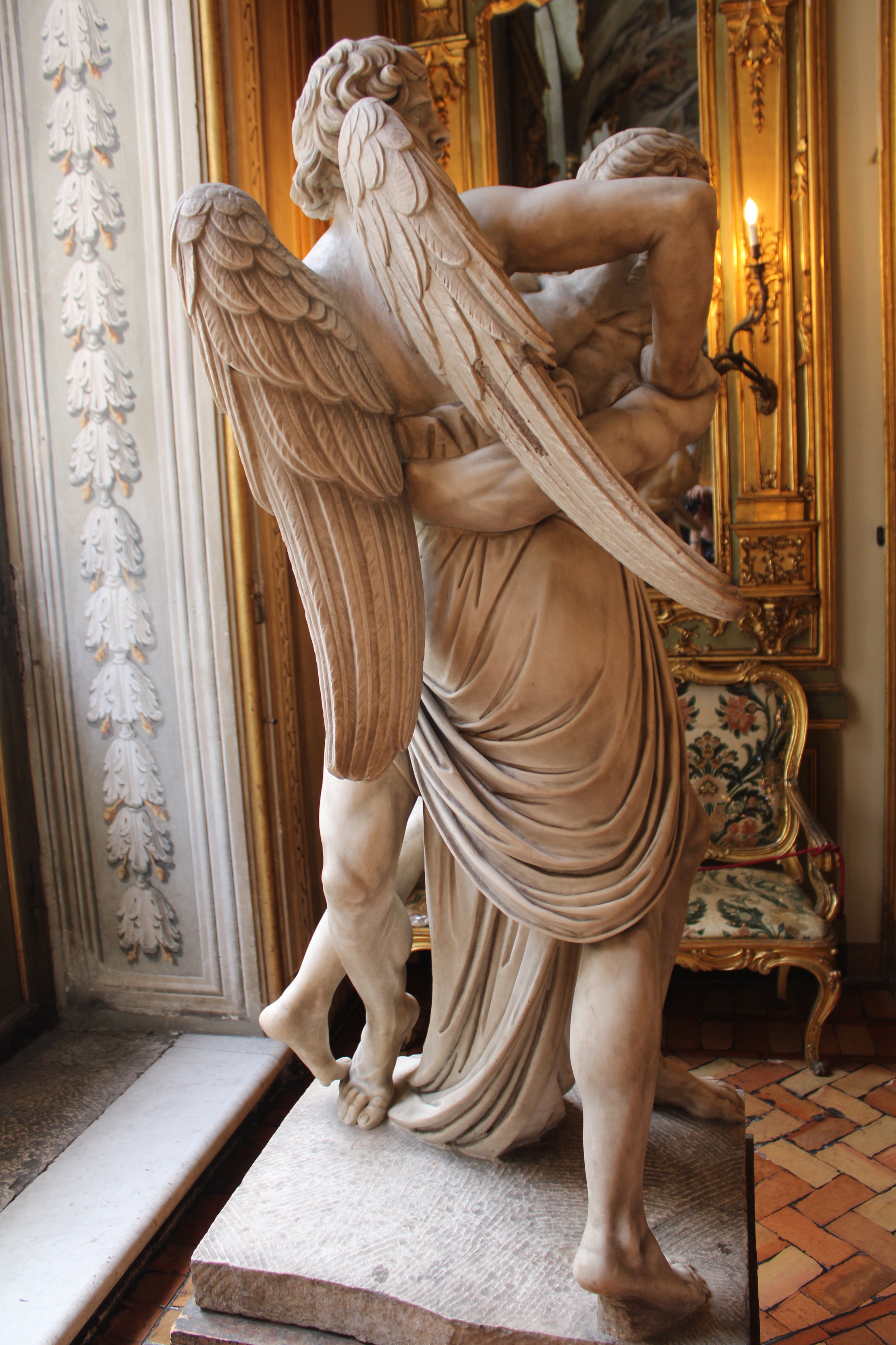 The protagonists of the sculpture are a good-looking young angel and a man of mature age. Both look in the same direction and their faces are marked by an expression of amazement, almost as if they were suddenly seized by some vision capable of distracting them from the fight.