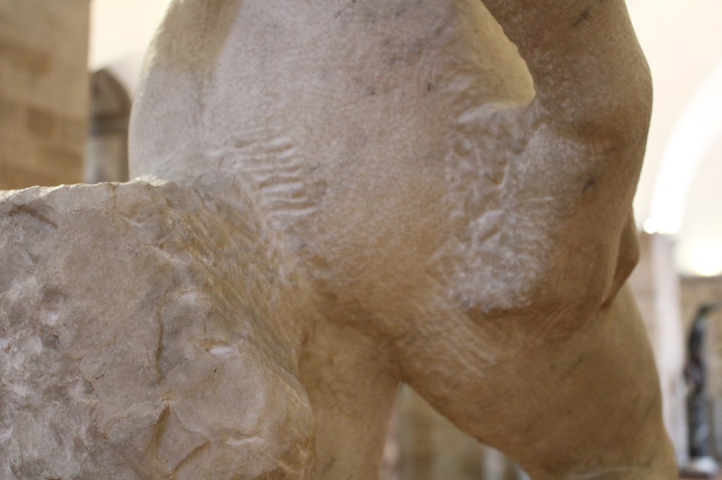 This is one of the plausible theories but that doesn’t convince me. To transform the work into an Apollo with quiver on his shoulders means that on the back of the work there was still a lot of choice and marble to be worked, otherwise there would not have been enough material to model the quiver.