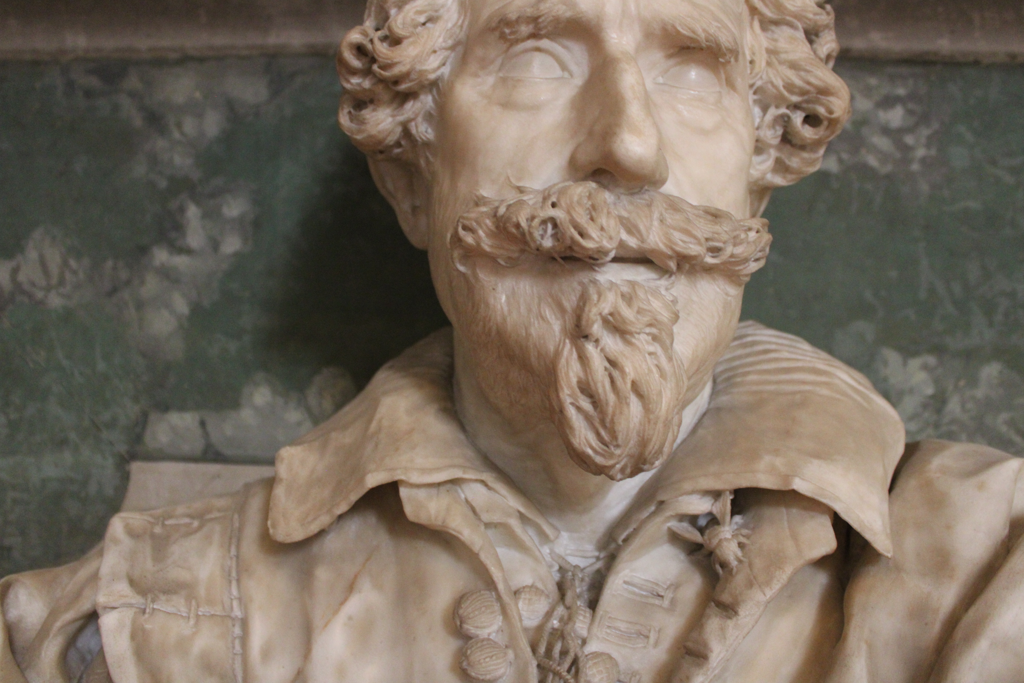 Il Finelli scelse di raffigurare il mio pronipote avvolto nell’ampio panneggio di un mantello. Riprodusse con cura maniacale baffi, barba e pizzetto dando all’opera un’aspetto reale.