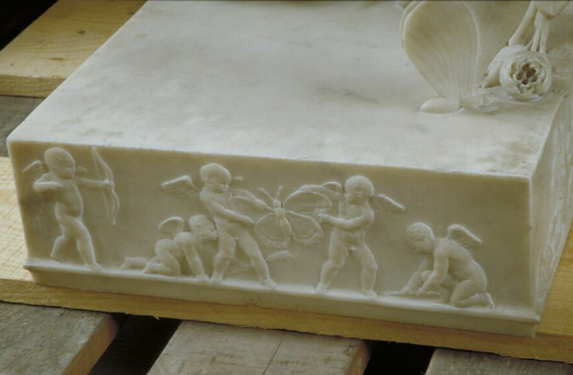 Nel basamento dell’opera si ribadisce il concetto che l’artista ha proposto nella scultura con cupido alato che tenta di scoccare la freccia in direzione della farfalla trattenuta da due putti mentre altri due soffiano sulle fiaccole accese, alimentando sempre di più il desiderio d’amore.