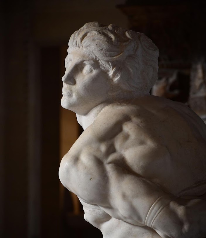Lo Schiavo Ribelle avrebbe dovuto essere inserito in uno degli angoli del monumento funebre. Guardate infatti la spalla destra che praticamente non esiste e il rispettivo lato dell’opera che di fatto è piatto.