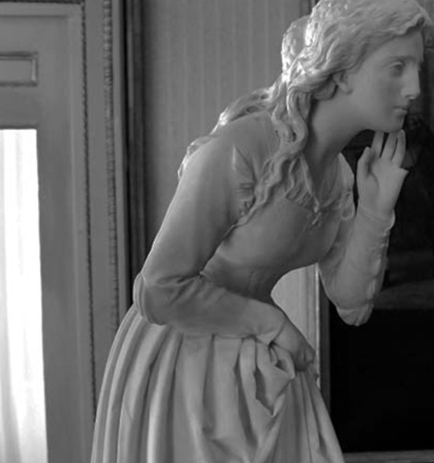 Bernasconi presented his work for the first time at the 1868 Brera Exhibition proposing a perfect translation in marble of a passage found in the twenty-sixth chapter of the book: “The mistress puts her finger to her mouth, listens and is listening. That melancholy air is not new to her: she stands up refreshed, takes her steps lightly, comes to the Veroncello, sticking her head out to better understand each note, then says softly to Lauretta: “It’s the prelude of the Rondinella: but stay, let the song begin”.