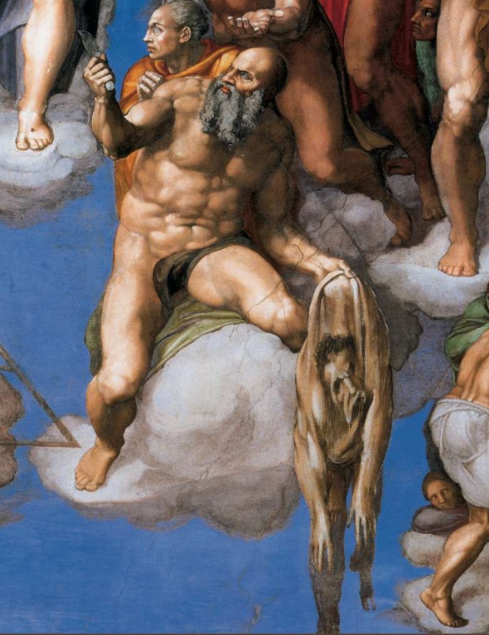 Dedicai a lui un posto d’onore nel Giudizio Universale. E’ infatti una delle figure più conosciute del grande affresco e tiene in mano la pelle che gli hanno strappato di dosso la quale custodisce un segreto.