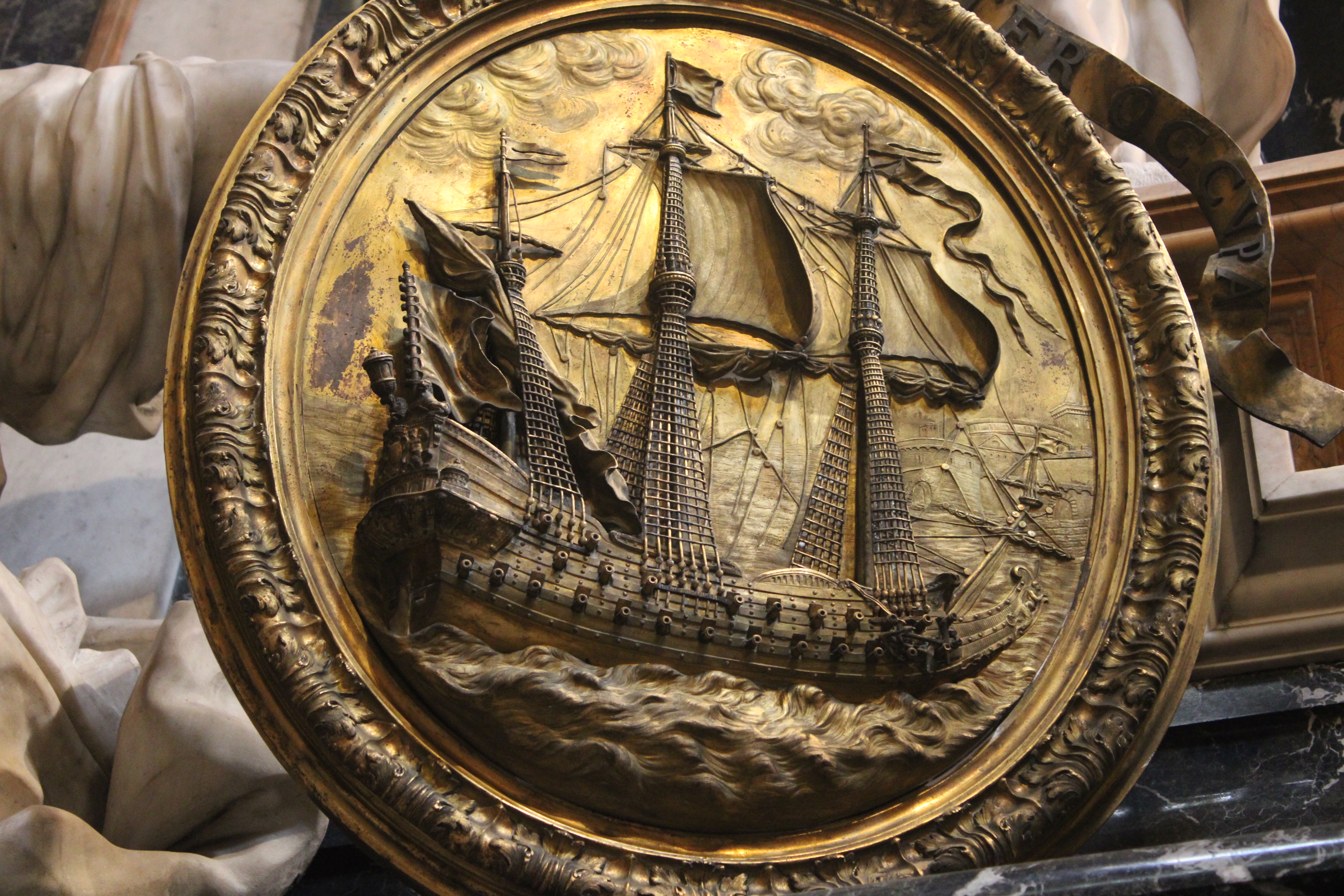 The sarcophagi were made of precious portoro marble and then surmounted by Carrara marble sculptures and gilded bronze medallions. The medallion on the right depicts the vessel of San Giovanni-San Cosimo which gave rise to the fortunes of the Marquis buried there while the other represents Francesco Feroni.