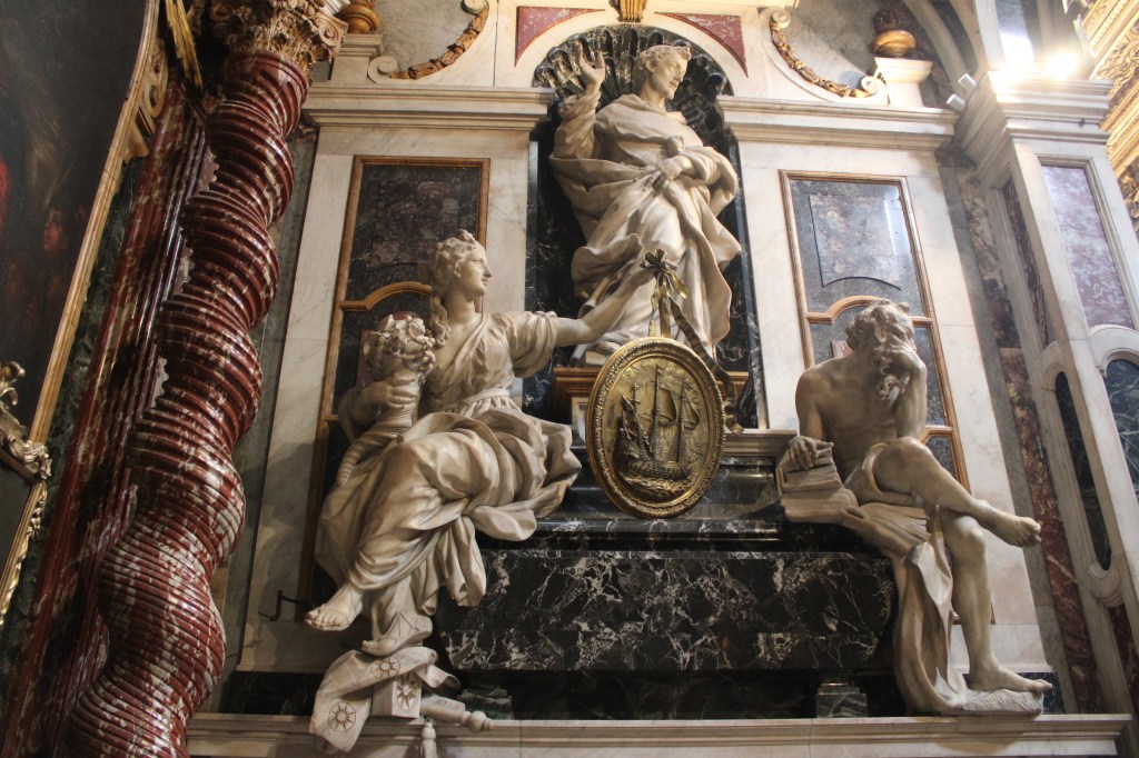Below him we see the allegories of Thought and Fortune on the Sea which represent the qualities that allowed the deceased to excel in maritime trade. Both were sculpted by Giuseppe Piamontini.
