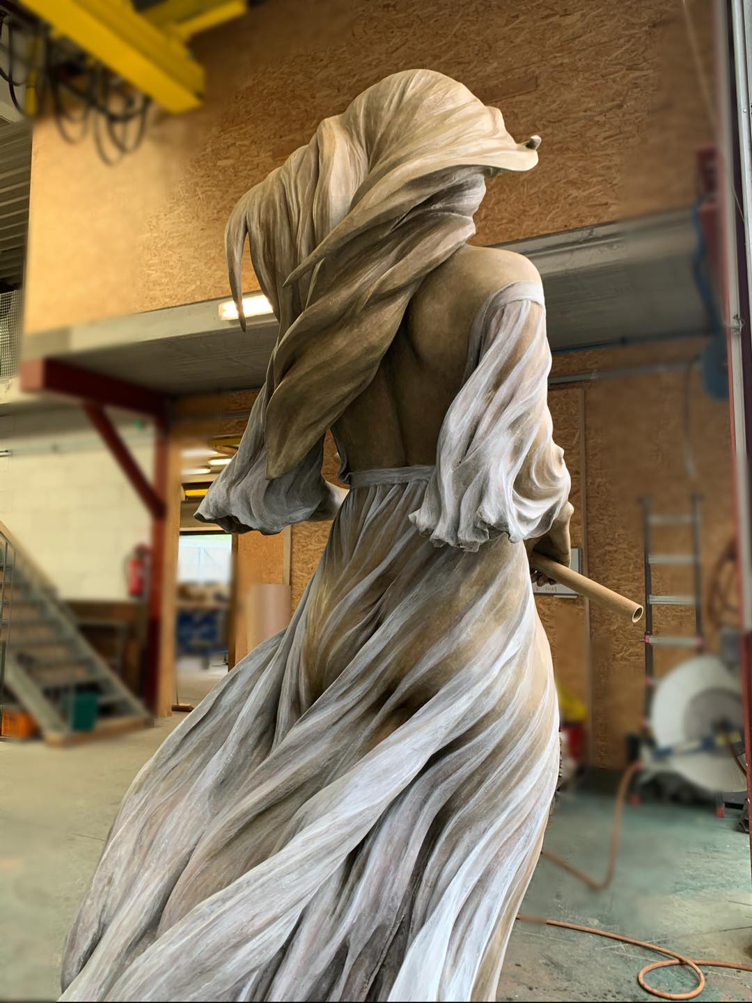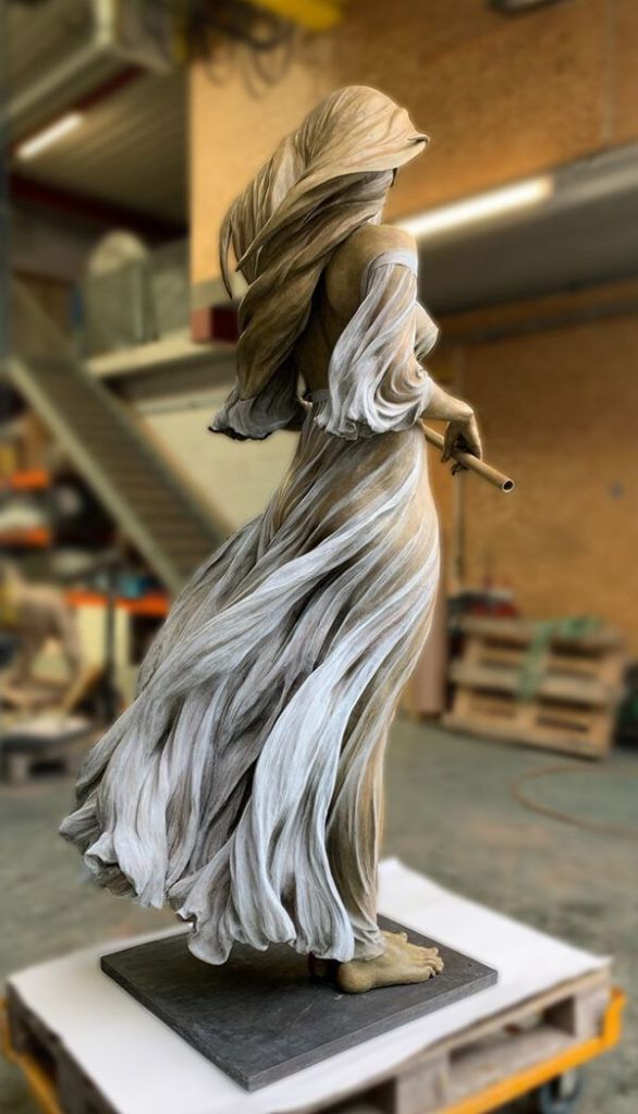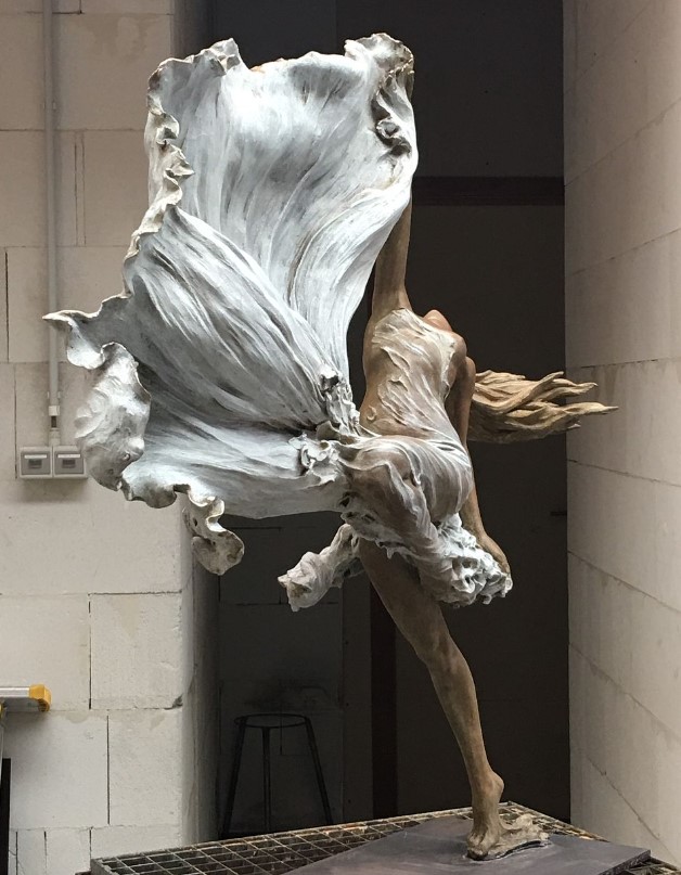 Un’opera in bronzo contemporanea caratterizzata da una prorompente sensualità e da quell’abito panneggiato che sembra trasparente, movimentato dal vento.