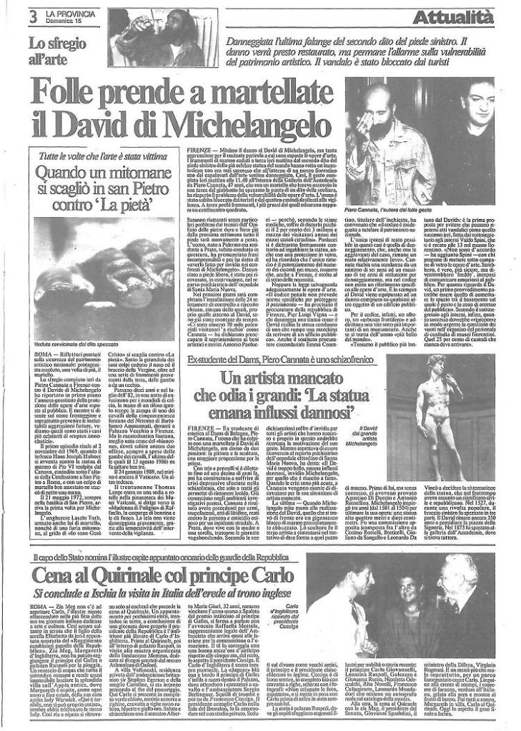 Il pazzo fu repentinamente bloccato da dai visitatori e da quattro custodi della vigilanza. Pietro Cannata, autore di quel disastro, all’epoca aveva 47 anni ed era riuscito ad entrare nella Galleria dell’Accademia con un martello nascosto nella tasca del giubbotto per poi scagliarsi contro il piede del David staccandone parte del dito.