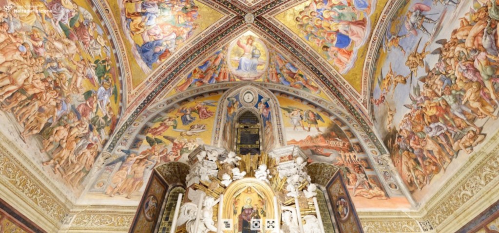 Prima di lui aveva lavorato lì niente meno che il Beato Angelico. Il Signorelli stravolge l’impronta medievale più tipica del predecessore creando una composizione illusionistica prospettica incredibile.