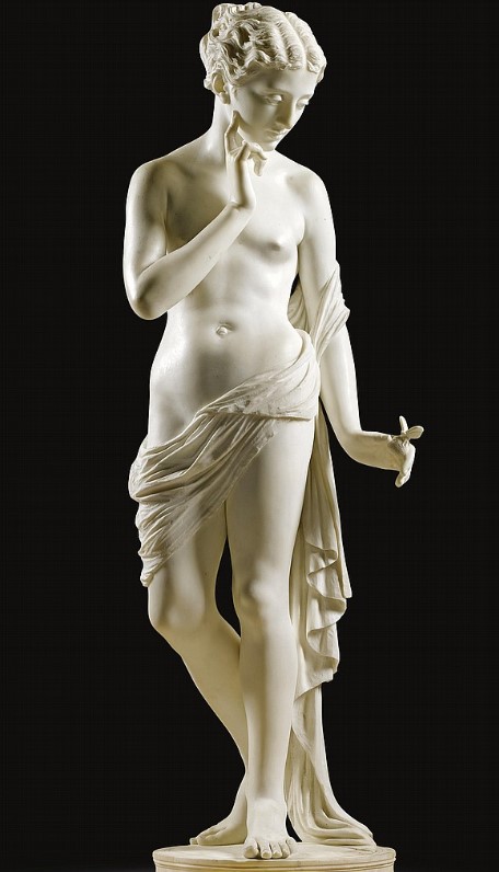 Priva di vesti, la giovane ha il pube coperto da un panneggio che scende fino a terra aumentando la superficie che scarica il peso a terra dell’opera ma che non cela alla vista le gambe.