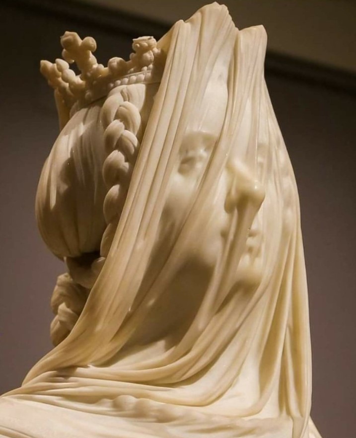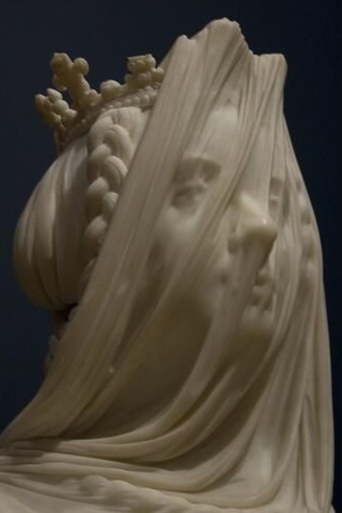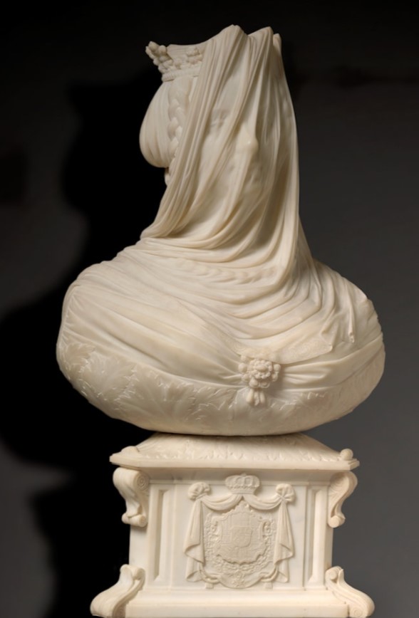 Torregiani, referring to previous veiled models such as the masterpiece of the Veiled Christ by Sanmartino or the Vestal Virgin by Monti which was only a few years earlier, sculpted the bust of the queen, covering her face with a thin drapery that allows a glimpse of her forms without hiding them.