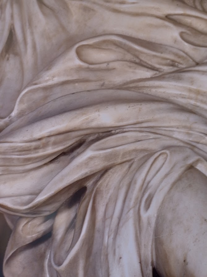Il panneggio con quelle pieghe profonde rese tali da un intenso lavoro di scalpello, ragalano dinamismo all’intera opera che ingombra tutta la nicchia.