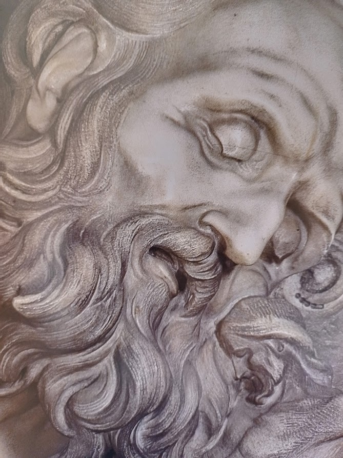 The differentiated processing of the marble surface which varies from the smoothness of the face and chest to the rougher one of the beard creates different light effects which highlight or obscure every detail.