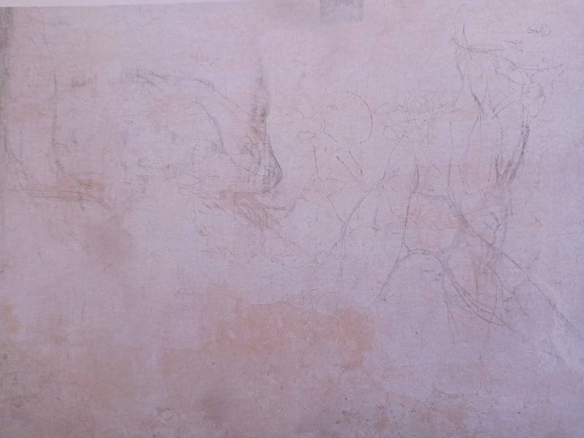 By carefully observing this study on the wall and the sculpture of Night seen from behind, the same pose is found even if the most bent leg is the right and not the left as in the allegory placed on the sarcophagus of Giuliano de’ Medici, Duke of Nemours.