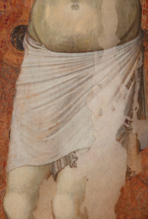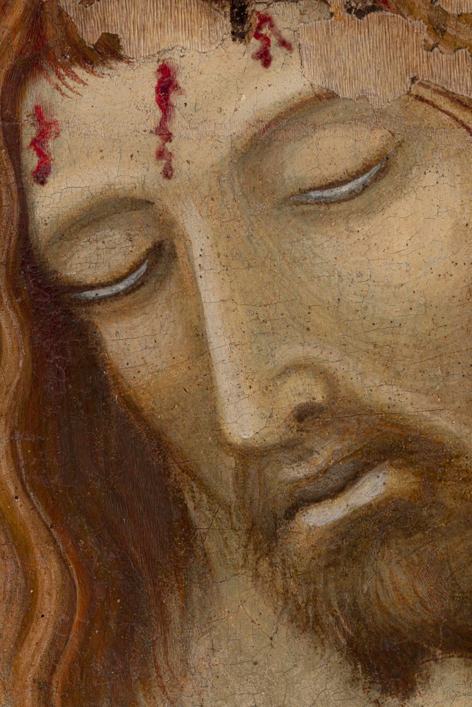 L’analisi stratigrafica ha evidenziato la modalità di stesura del sangue che scorre dalle ferite di Cristo, eseguito con due tipi di rosso: uno di base, più corposo e ricavato dal cinabro, al quale si sovrappone uno strato più scuro e brillante in lacca rossa, ottenuta col rosso kermes, un pigmento prezioso, più costoso dell’oro, che è segnale evidente di una committenza di rilievo.