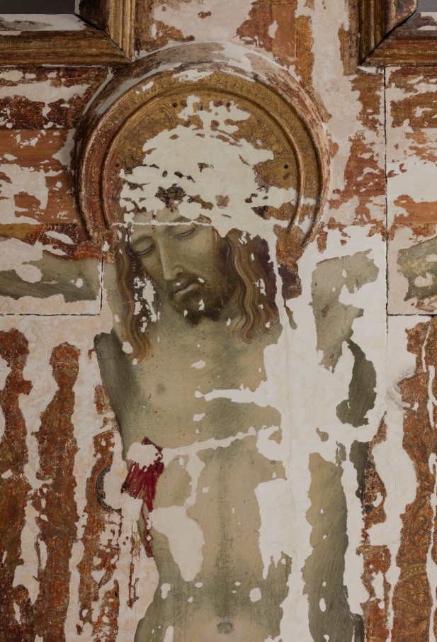 At Lorenzetti’s time, when the Cross was displayed in the church, lighting was provided only by the natural light that filtered through the windows, changing in intensity and direction depending on the time of day, and by the flames of the candles. These light sources gave the pictorial material a lively and changing luminosity which highlighted the plasticity of the painted anatomy of Christ’s body, where the most important points are the shoulders and knees.