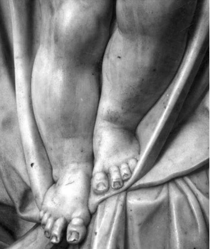 La posizione elevata della Madonna di Bruges rispetto al piano di calpestio della chiesa fa perdere completamente la visione di alcuni dettagli come i bottoni che decorano i polsini dell’abito della Madonna e le fossette sulle nocche del Bambino.