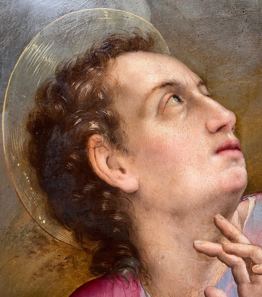 The work had previously been subjected to a rough and drastic cleaning, probably in the nineteenth century. It was altered by touch-ups on the saints’ drapery and by repainting on the clouds at the height of Saint Peter’s raised arm, to hide the deterioration caused by candle smoke.