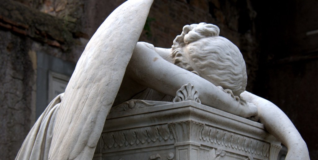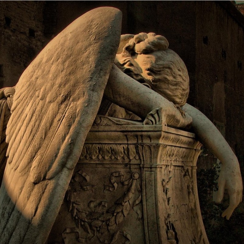 Alla base del piedistallo si vedono dei fiori scolpiti, quasi come se l’angelo li avesse lasciati andare dalla mano sospesa. Le ali non si elevano verso l’alto ma sono ripiegate con estrema cura sulla schiena. Pare non ci sia speranza nella sua gestualità a solo un profondissimo sconforto.