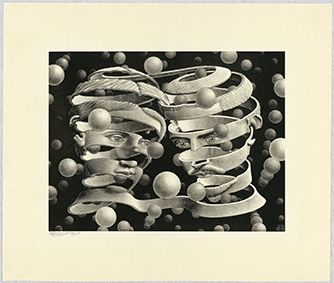 Fin dalle sue prime opere, più ancora che per l’elemento pittorico, Escher dimostra un’attenzione particolare per l’organizzazione dello spazio compositivo. Come abbiamo visto a partire dalla metà degli anni ‘30, Escher si staccherà progressivamente dalla rappresentazione euclidea dello spazio. Il suo crescente interesse per la matematica e la geometria passa attraverso lo studio e il fascino che esercitano su di lui sfere, superfici riflettenti, solidi geometrici o ancora superfici topologiche come il nastro di Möbius, un oggetto percepito come superficie a due facce ma che, ad una più attenta osservazione, ne dimostra una sola. Potremmo parafrasare un suo commento alla litografia Mano con sfera riflettente del 1935, una delle sue opere più celebri, in questo modo: la sfera, riflettendolo, racchiude in sé tutto lo spazio circostante, al cui centro si staglia proprio colui che la guarda; l’uomo è quindi il centro di questo universo. Escher qui non dissimula una certa ironia riguardo all’ego dell’artista, immortalato in una dinamica autoreferenziale. La disamina di questi concetti porterà Escher ad esacerbare il suo gusto per i paradossi, le distorsioni prospettiche e le illusioni ottiche che queste figure permettono.
