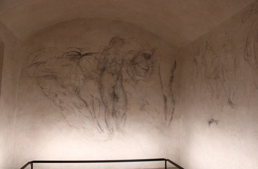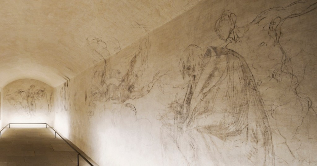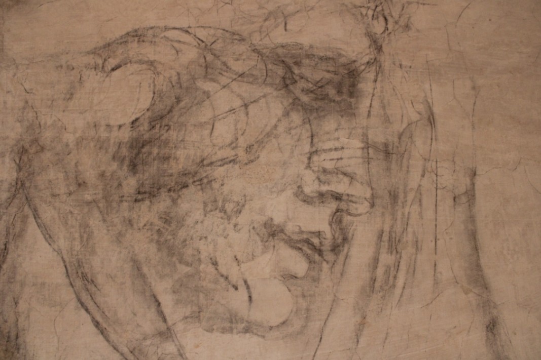 The restorer Giovannoni began to remove the two layers of plaster with the scalpel and with great surprise he began to see thick charcoal marks re-emerge on the wall. Giovannoni was joined by the restorer Guido Botticelli in uncovering the drawings centimeter by centimeter, all done with a scalpel.