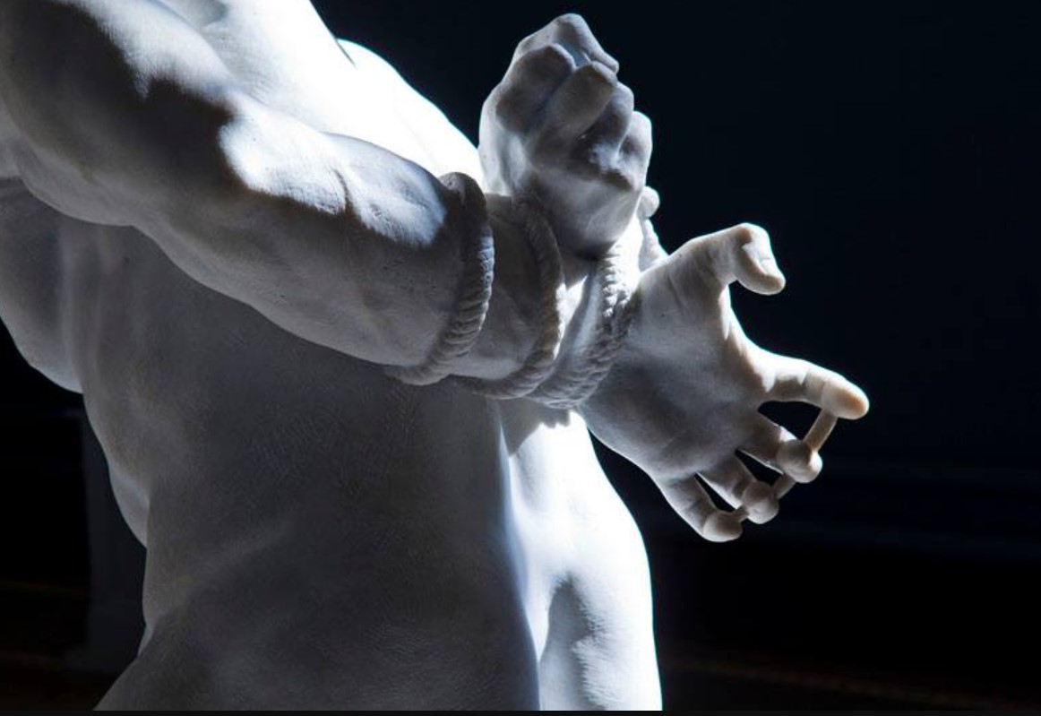 Mentre tenta di divincolarsi da quella stretta morsa ai polsi, lo Schiavo apre una mano contraendo però le dita e stringe a pugno l’altra in un moto di rabbia, non di frustrazione.