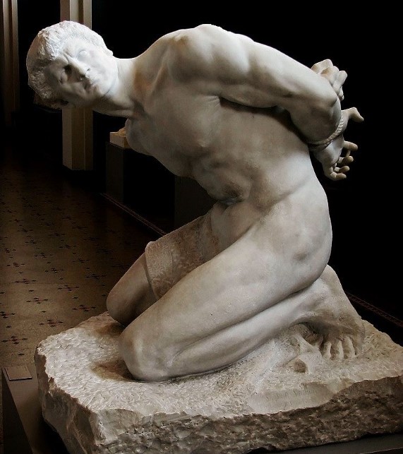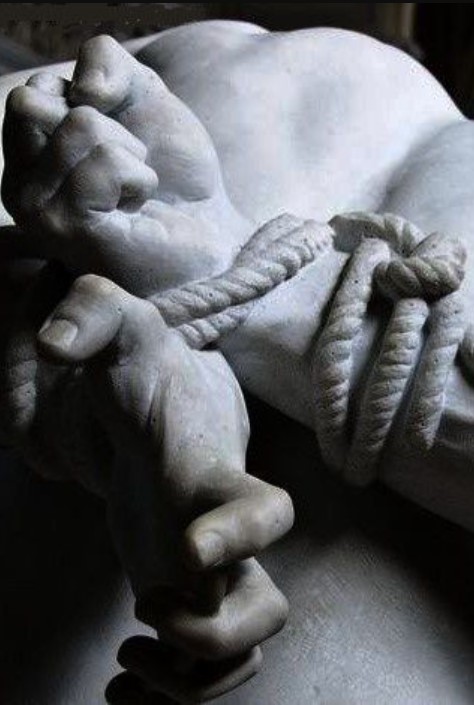 La parte più intensa di quest’opera sono le mani dietro la schiena che sembrano realmente legate con una corda di canapa ma in realtà è scolpita in modo magistrale.