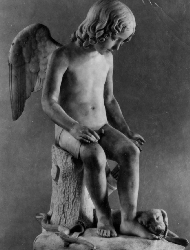 The work is to be read in an allegorical key: it represents the crying love for lost fidelity shown through the figure of a little dog lying at the feet of the young man depicting love. The sculpture captures the expression of the child in his pain and bewilderment, sitting in an attitude of abandonment, with a pained gaze directed at the small lifeless creature.