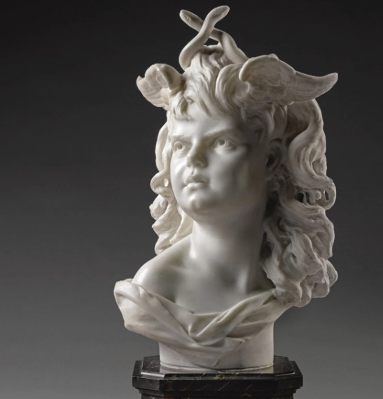 In her autobiography, Bernhardt says she was enthusiastic about that work and in particular she was fascinated by the role of Orestes played by the actor Jean Mounet Sully. It was then that she set to work on the sculptural bust thinking of Orestes, who was indirectly responsible for Hermione’s suicide. Taken by madness, Orestes begins to see Hermione appear before him accompanied by the Erinyes, the vengeful female divinities of hell and he lets out the exclamation “Who will meet those serpents hissing above your heads?”