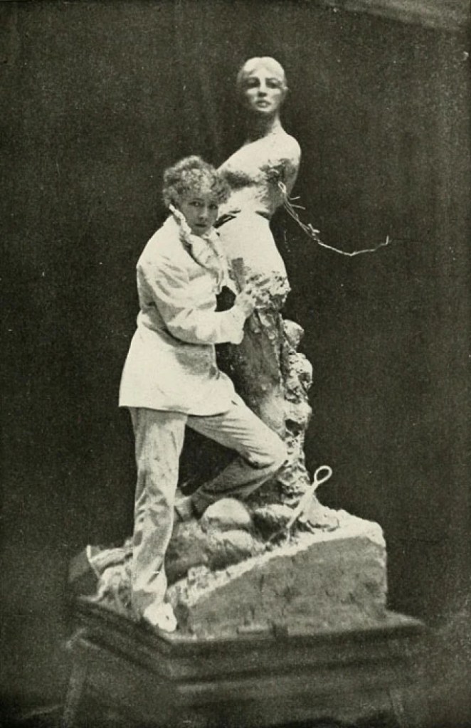 Posing confidently for photographs in front of her works while holding her chisel, Bernhardt was foolishly mocked in some newspapers for wearing a white trouser suit: an unforgivable transgression of women’s dress codes at the time.