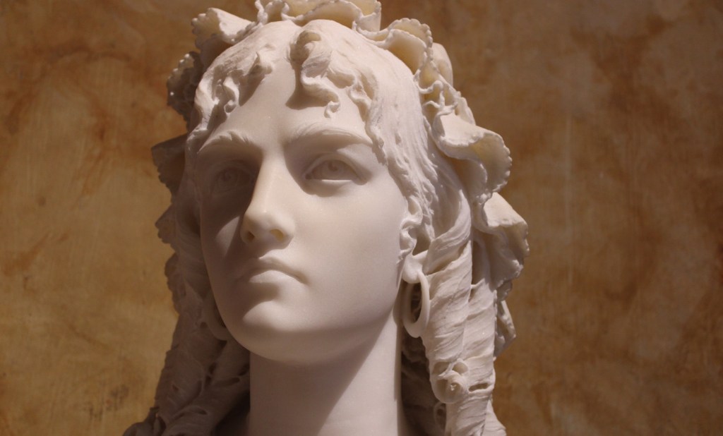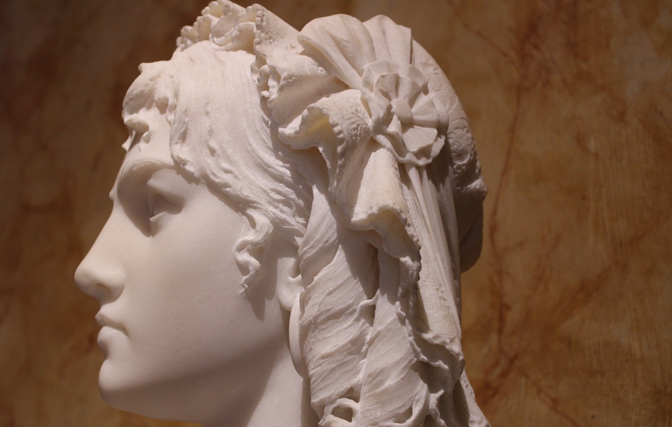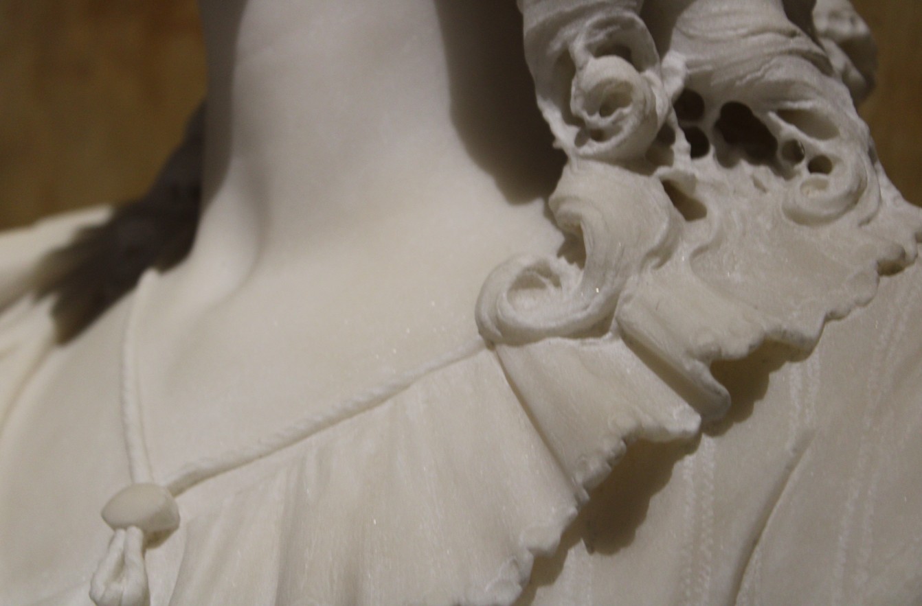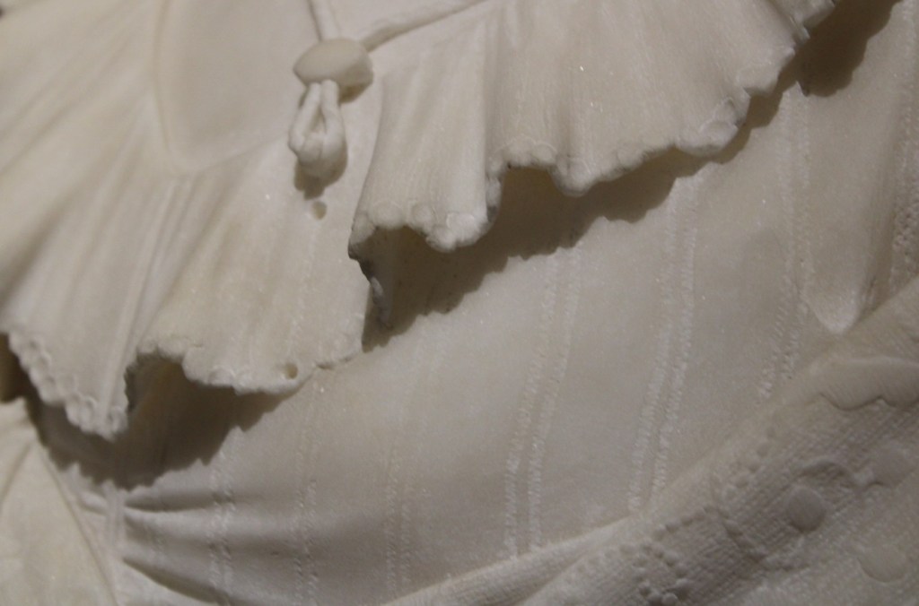 Si tratta di un raffinato busto di giovane donna scolpito nel marmo statuario di Carrara. Il volto segnato da un’espressione ferma e determinata è incorniciato da boccoli ordinati che spuntano dal di sotto di una cuffietta a balze che serve a coprire la parte della nuca.