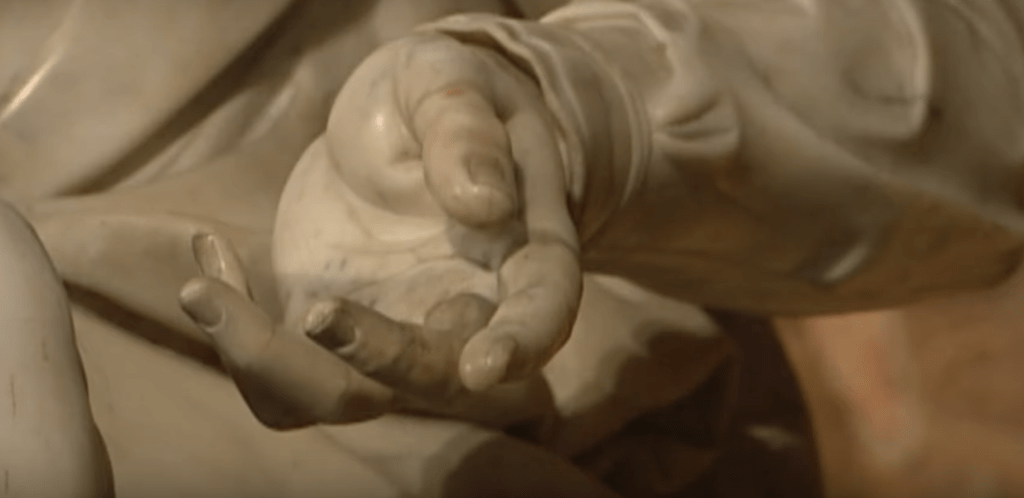 During a move of the Vatican Pietà carried out in the eighteenth century inside St. Peter’s Basilica, it suffered considerable damage. Due to an accidental impact, four fingers of the left hand separated cleanly from the palm. Just for a moment try to imagine that hand so disfigured, with only one finger.