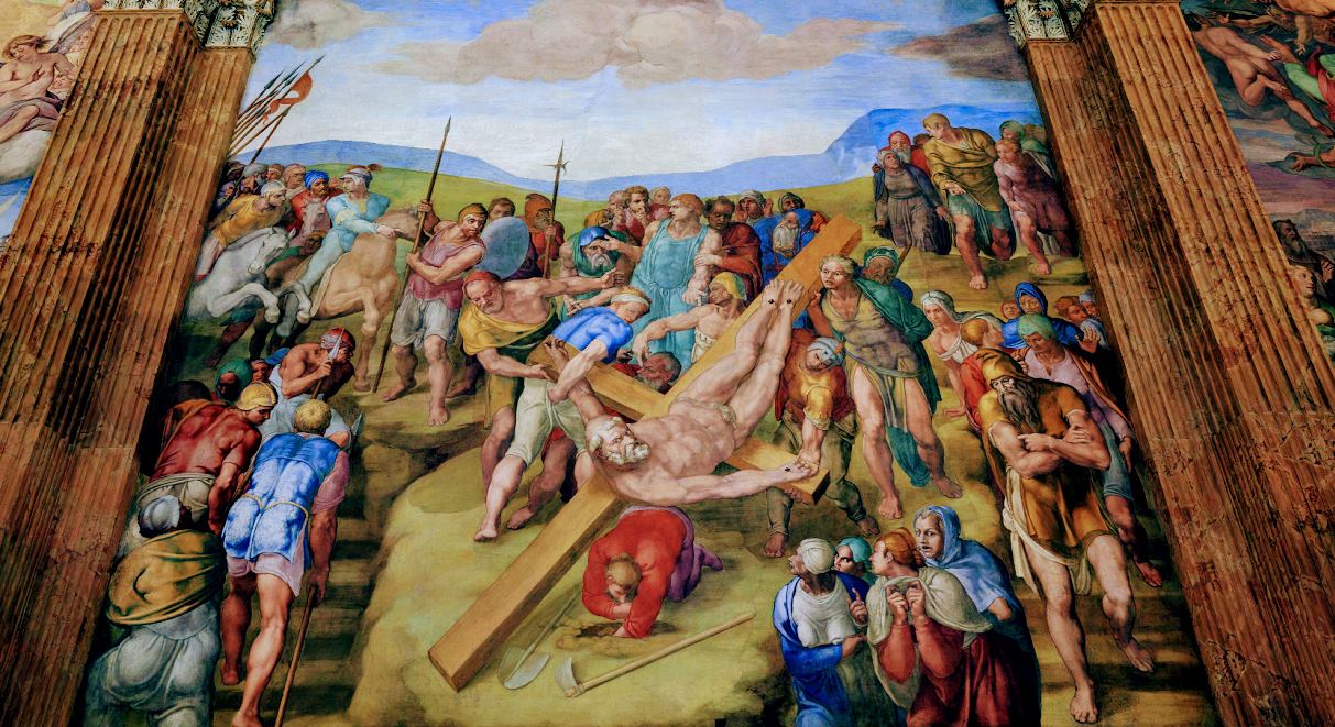 Mi misi al lavoro sulla Conversione a partire dal 1542 e la ultimai nel 1545 poi iniziai l’affresco con l’emblematica Crocifissione a testa in giù di San Pietro che portai a termine cinque anni dopo, all’età di 75 anni.