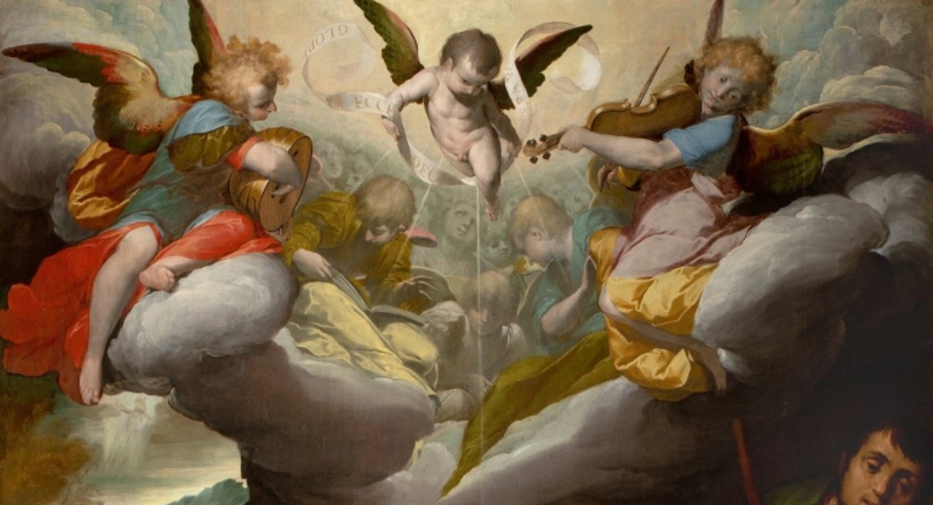 Mentre al centro un angelo con un cartiglio e privo di vesti pare rischiarare l’atmosfera, i due colleghi in primo piano sono riccamente abbigliati e suonano note celestiali adoperando un violino e un mandolino.