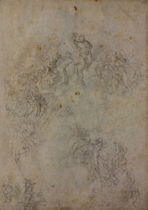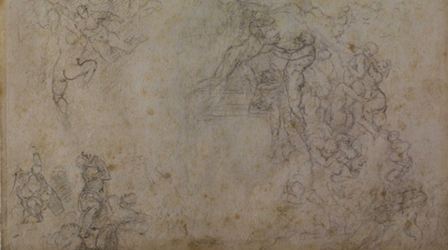 The drawing I propose to you today is the general study for the composition of the Last Judgment which I traced in black charcoal and red pencil on paper between 1533 and 1534.