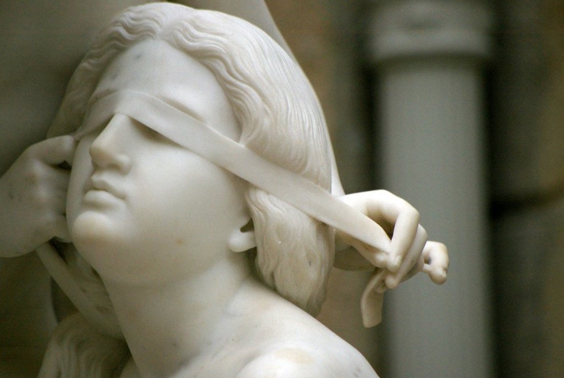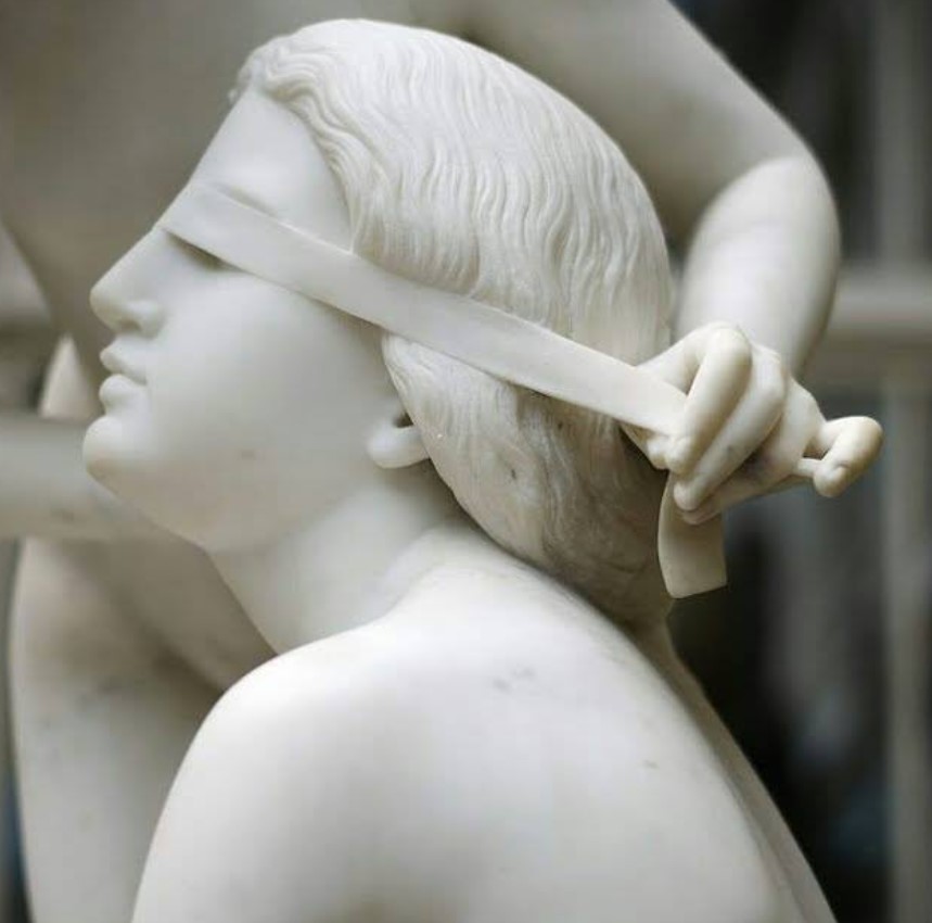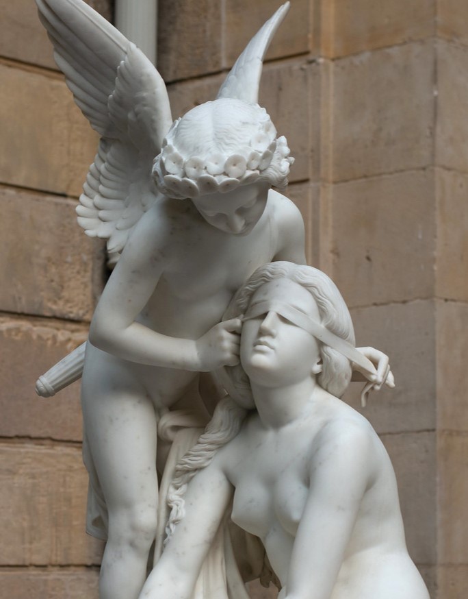 Mentre la donna con il busto scoperto e le gambe panneggiate mantiene il volto rivolto verso ciò che la aspetta, il dio dell’amore con la faretra sulle spalle e le ali spiegate, le lega dietro il capo la benda per impedirle di prevedere ed evitare l’errore nel quale sta per cadere.