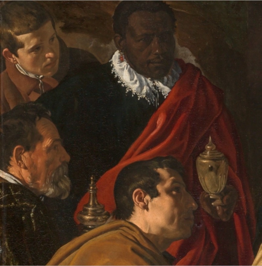 Dinnanzi al Bambino si inginocchia il Re Magio più giovane che potrebbe essere un autoritratto del giovane artista, avvolto in un manto color ocra, che si protende verso di Lui offrendogli il suo dono. Immediatamente dietro questo magio ne compare un altro più anziano, con il volto caratterizzato da una barba brizzolata. Probabilmente è lui il suocero e pittore Francisco Pacheco del Rio.