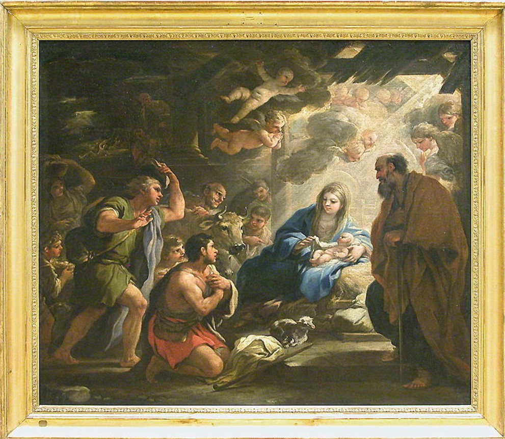 Luca Giordano painted the Virgin wrapped in a celestial mantle at the center of the scene, as tradition dictates, while showing the Child to the shepherds who arrive at the cave to pay homage to him.