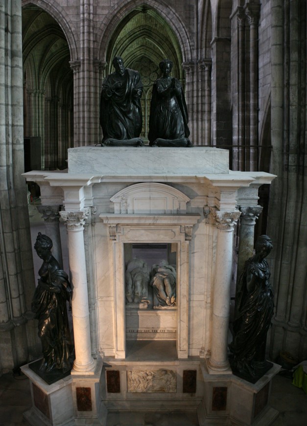 Catherine de’ Medici died in the Castle of Blois on 5 January 1589 and was buried, respecting her wishes, in the basilica of Saint-Denis alongside her husband Henry II, inside the tomb in the Valois rotunda created by Germain Polon .