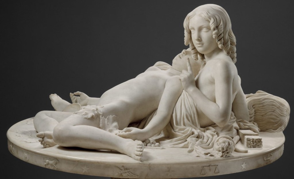 The subject depicted is a complex cosmological allegory that Bartolini himself wanted to describe as follows: “Lying on the plane of the world is Cupid, god of generation, who supports and watches over the symbolic genius of dissolute wealth without virtue, who snores in his sleep, dreaming of past pleasure pastimes.