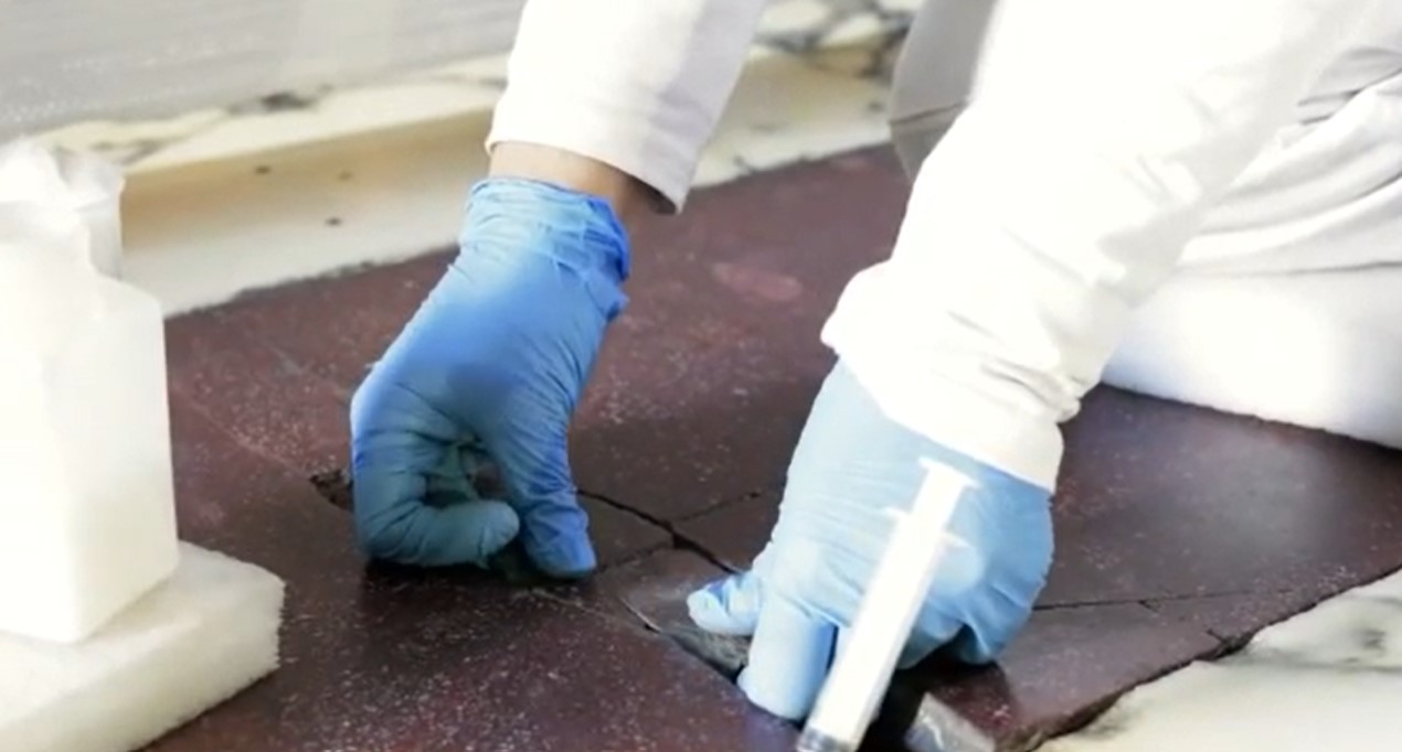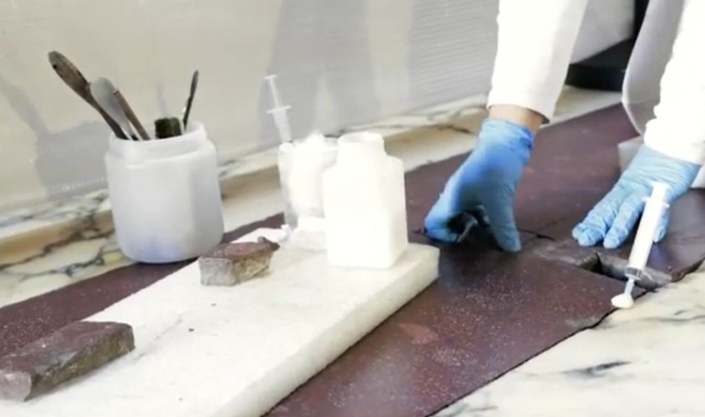 Subsequently, special pigmented fillers will be applied that respect the chromatic variety of the marbles to restore the correct flatness of the flooring and guarantee its better preservation in the future.