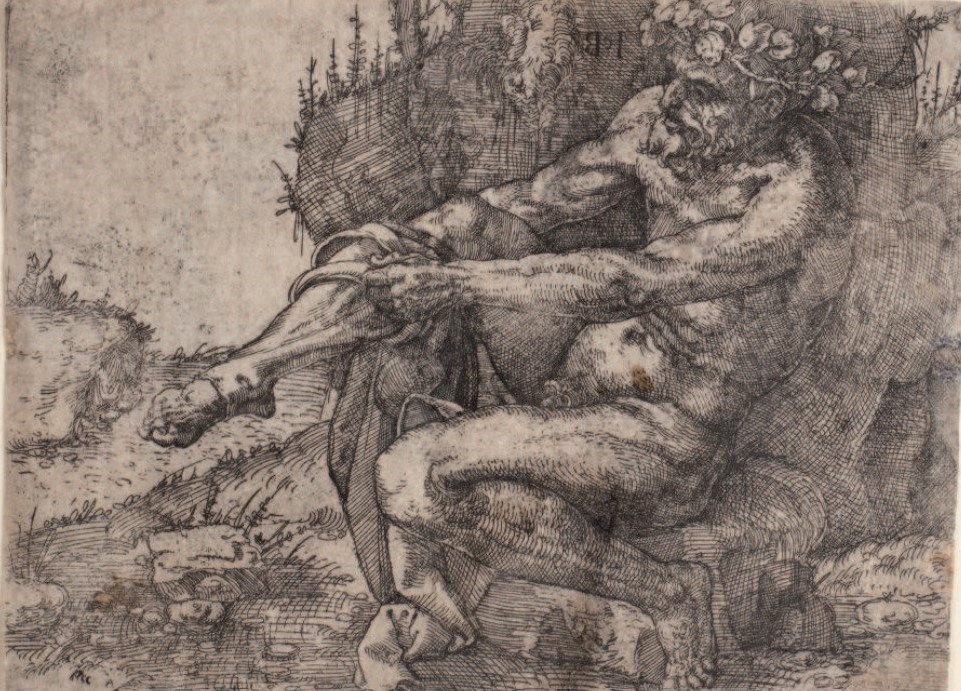 The old man, sitting on a stone in the foreground on the right, can be seen clearly in the copy made by Sangallo and can be seen in even more detail in the copy by the Cologne painter Jacob Binck.