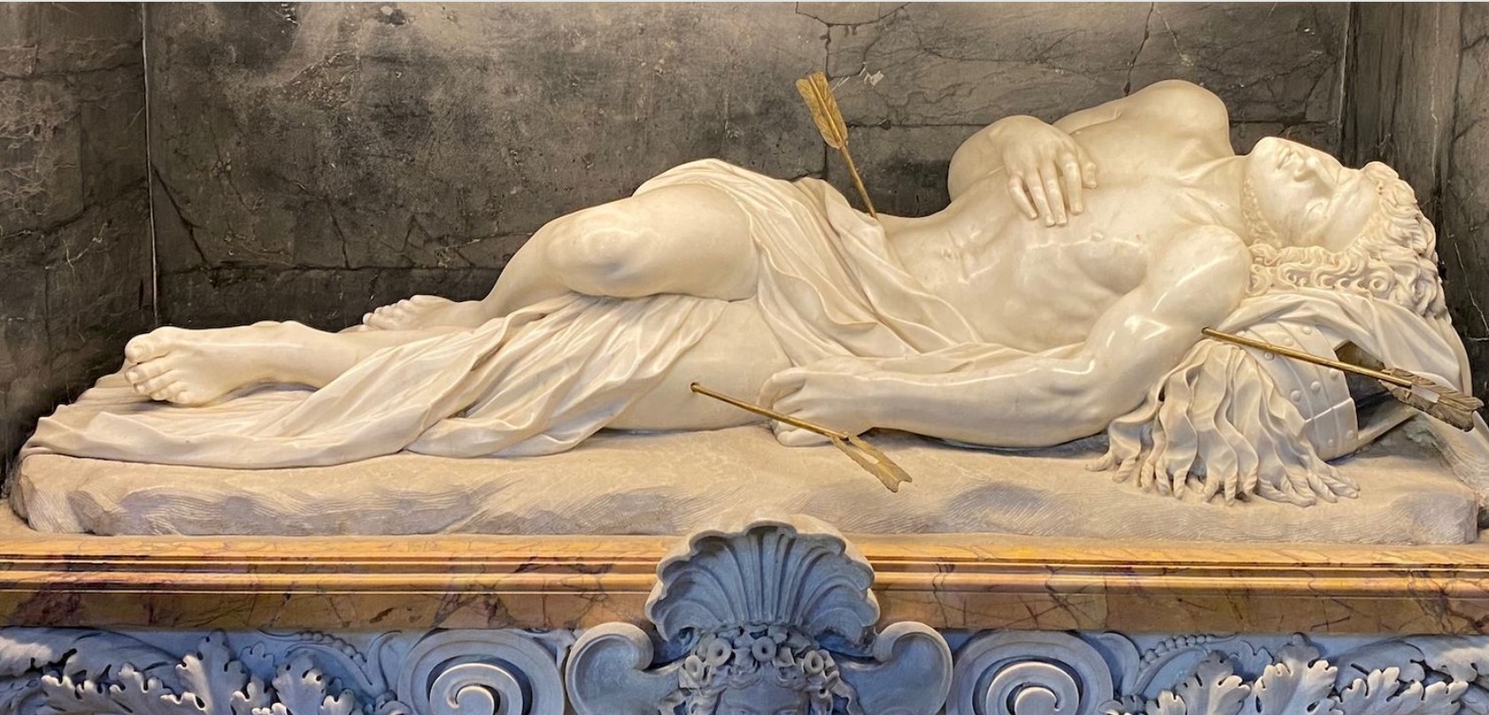 The sculpture of the day that I propose to you today is the lying Saint Sebastian sculpted by Giuseppe Giorgetti in 1672, probably based on a design by the more famous Antonio Giorgetti, his brother.