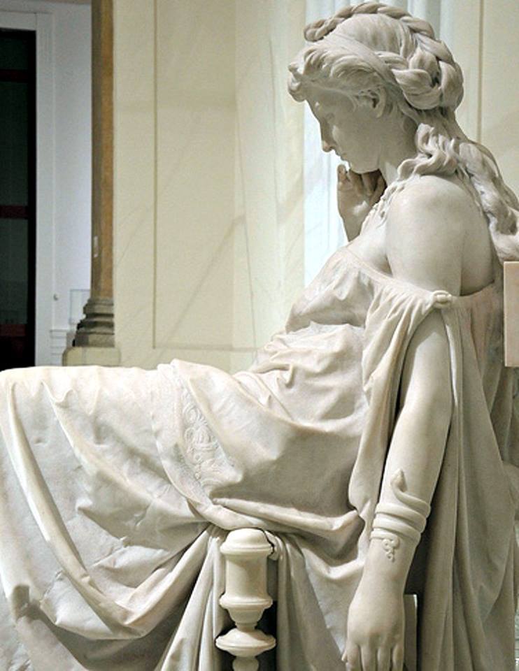The Florentine sculptor Masini wanted to depict the woman in all her calm and pride. He sculpted her sitting with her legs crossed and her face concentrated in some doubtful thought. She rests her head on her hand and has a richly draped dress that magnifies her figure, increasing its importance.