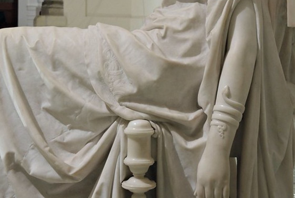 On her left wrist Fabiola wears a snake-shaped bracelet. In this case the sculptor Masini took poetic license in depicting this symbolic object. In fact, the serpentine bracelets always had to be worn in pairs and on the forearms, not on the wrists.
